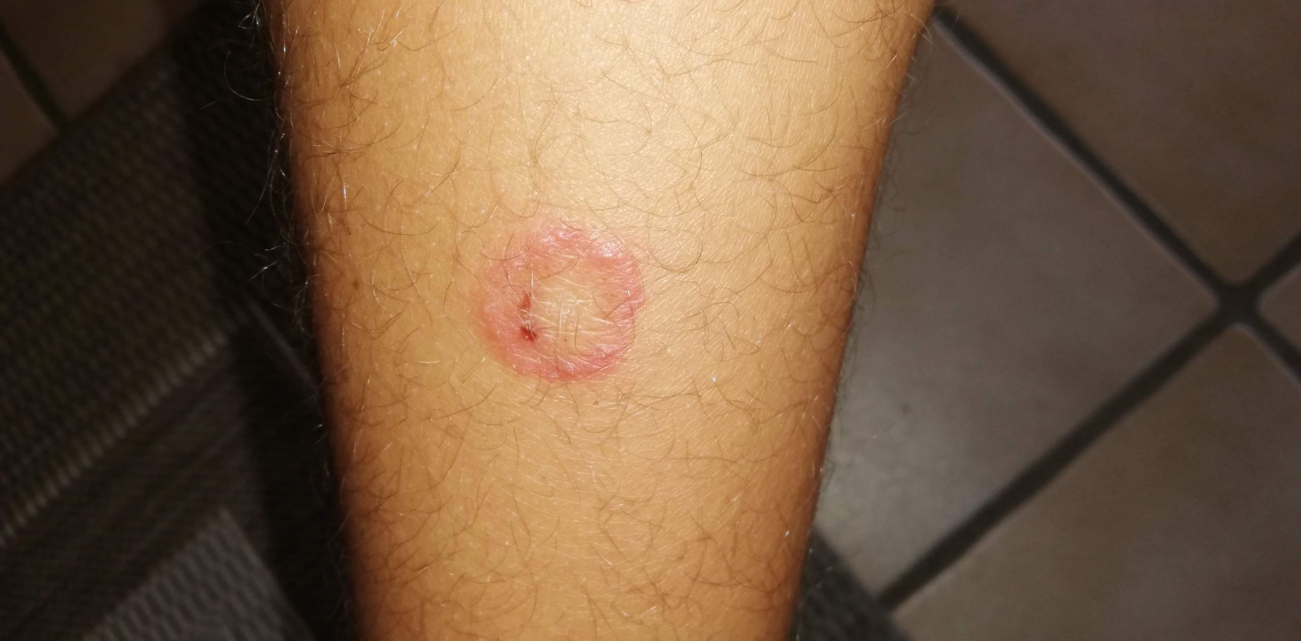 Eine von geröteter Haut umgebene Blase Geschwür. So manches Insekt wehrt sich mit seinem Stachel oder seinen Zähnen gegen etwaige Angriffe.